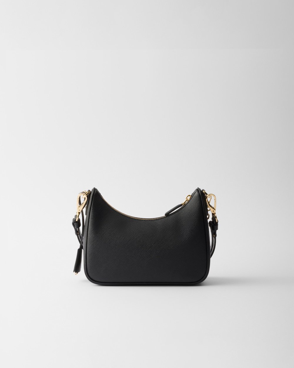 Sleek lines and iconic details define this versatile bag characterized by removable chain and leather handles. The accessory made of Saffiano leather is embellished with the distinctive enameled metal triangle logo.