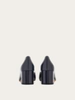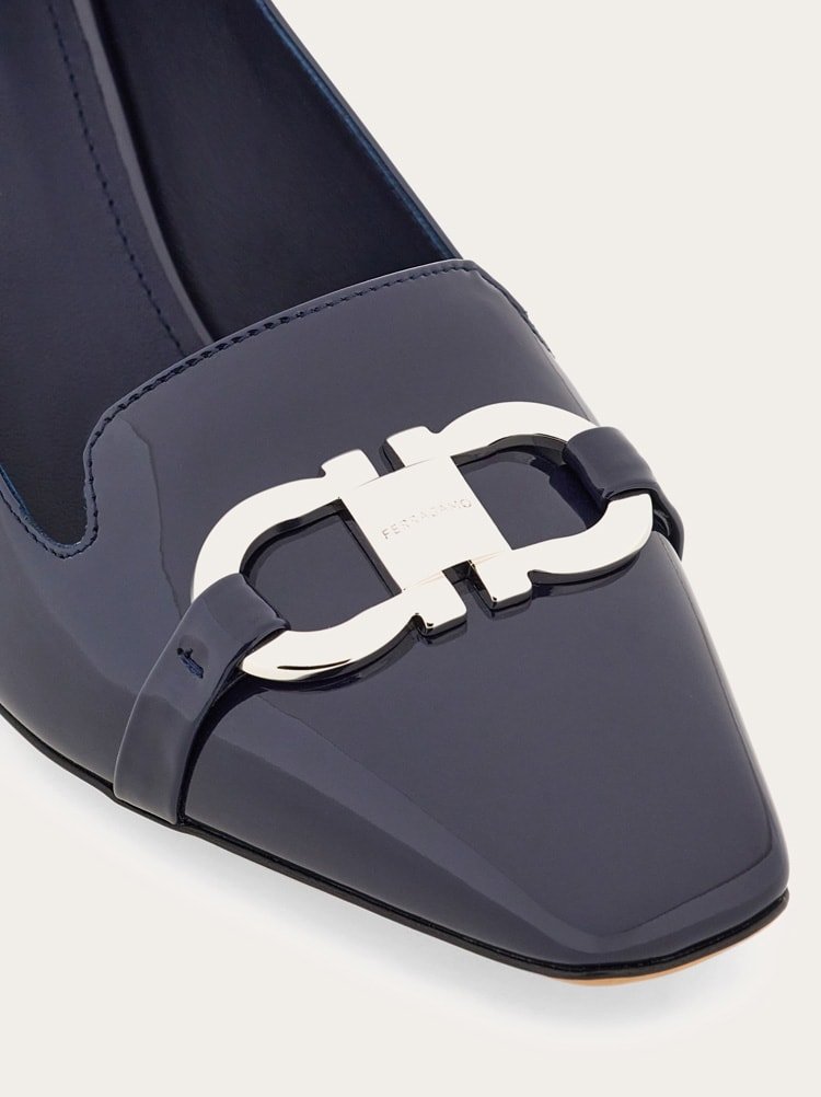 Uptown girl. A new twist on the iconic Ferragamo loafer, the vamp on this block heeled slip on is inspired by the classic silhouette. Made of the softest patent, it has a Gancio buckle on the instep, held by a custom square tab in the center. The large covered heel ensures all day comfort for strutting the runway of life.