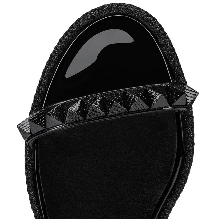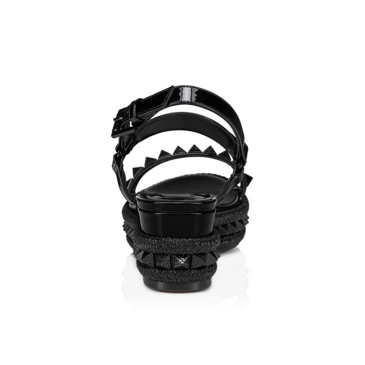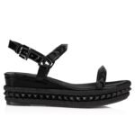 Maison Christian Louboutin’s Pyraclou is a wedge sandal that stands out from the crowd. It has two slender straps adorned with glossy pyramid-shaped signature spikes. The bottom of the 60 mm wedge is also adorned with a row of spikes and these are outlined with a decorative rope. This model showcases black patent calf leather and is finished with tonal lining.