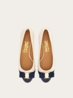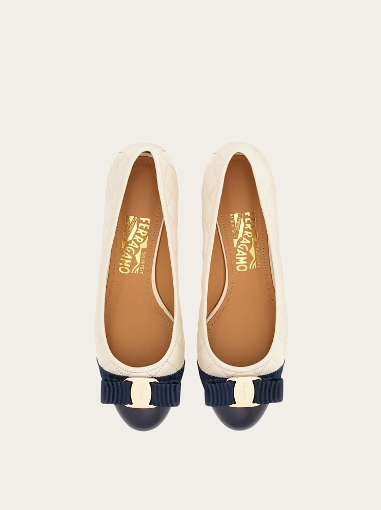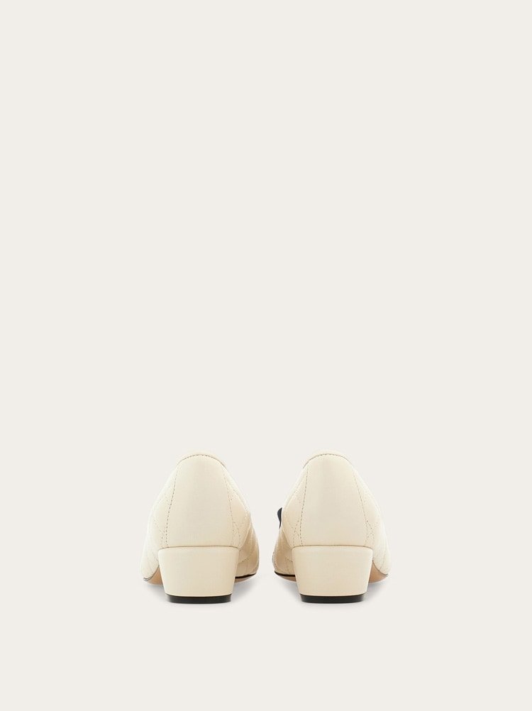 A simple, elegant classic with a modern twist. The iconic Ferragamo pump shoe has a new look in quilted nappa leather. This sumptuous slip on has a grosgrain Vara bow across the toe and a contrasting patent insert. Chic and timeless.