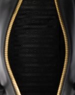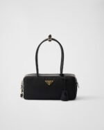 This structured top-handle bag, crafted from Re-Nylon and leather, presents a compact silhouette with sophisticated charm. The metal hardware and the enameled metal triangle logo adorn the style, while the zipper and padlock closure add a unique accent.