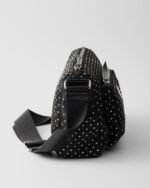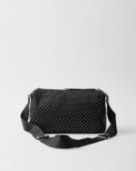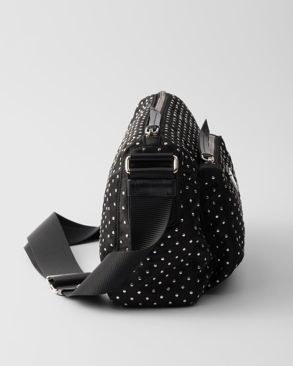 This modern Re-Nylon bag combines soft lines, sporty accents, and the contemporary edge of all-over mini studs. The distinctive triangle logo embellishes the versatile design with an adjustable shoulder strap.