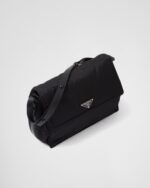 This padded shoulder bag with soft lines is made of Re-Nylon, the sustainable evolution of an industrial fabric made iconic by Prada in the eighties. The flap bag has an adjustable leather shoulder strap in a mix of classic and modern materials for an elegant attitude and urban style. The accessory with back pocket is decorated with the enameled metal triangle logo that stands out on the flap.