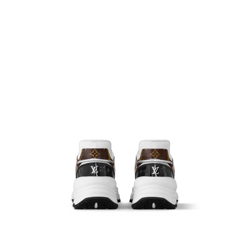 The Run 55 sneaker comes in a mix of technical materials, which are overlaid on the elaborately constructed upper. Monogram-canvas trim complements this design, which is notable for its numerous signature details, including the LV Circle logo on the tongue. It is finished with a lifted rubber outsole for optimum bounce and comfort.