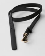 This belt characterized by its sleek, refined design is completed with a metal buckle that recalls the emblematic triangle logo. The design is made of the brand’s iconic Saffiano leather with its distinctive waxed finish and crosshatch texture.