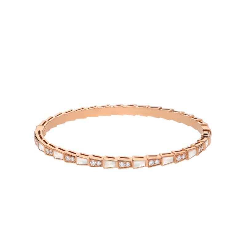 The Serpenti Viper bracelet in 18K rose gold, adorned with pave diamonds and white mother-of-pearl, is a signature style that cleverly combines pure aesthetics, wraparound shapes and charming charm, and simply interprets the endless transformation and evolution of Bvlgari’s classic works. This charming jewelry piece embodies the powerful characteristics of the mysterious snake’s continuous transformation, inspiring people to actively seek change and regard it as an inexhaustible source of strength and confidence. It is suitable for mixing and matching at will, providing a variety of styling options, showing the flexible and versatile style of the series.