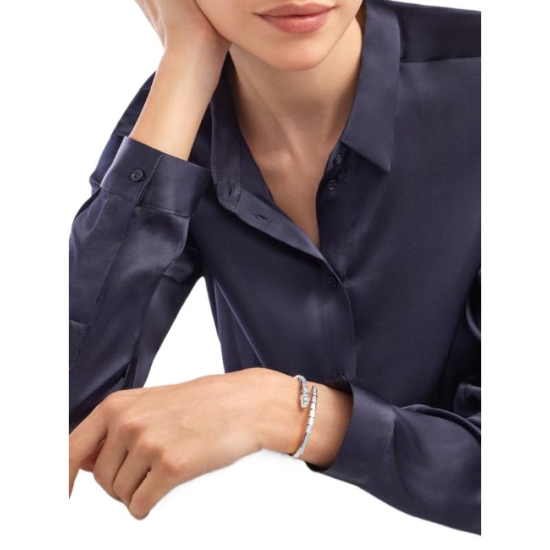 The Serpenti Viper bracelet in 18K white gold and semi-pave diamonds is a signature combination of pure beauty, circumferential shapes and allure, a simple and concise interpretation of the endless transformation of Bvlgari’s classics. This glamorous jewelry piece embodies the powerful characteristics of the mysterious snake’s constant transformation, inspiring people to actively seek change and regard it as an inexhaustible source of strength and confidence. It is suitable for mixing and matching, providing a variety of styling options, showing the flexible and versatile style of the series.