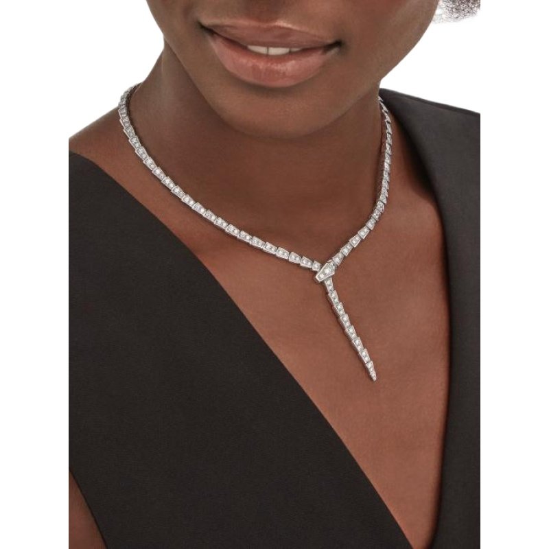 Bvlgari pays tribute to its animal by capturing the allure, seduction and charming sensuality of the Serpenti Viper necklace in a mesmerizing design. This jewel of elegance lingers around the neck, its beautiful scales gleaming with the ultimate in light, capturing the unique curves of the snake. Serpenti Viper thin necklace in 18K white gold, fully pavé diamonds.