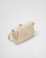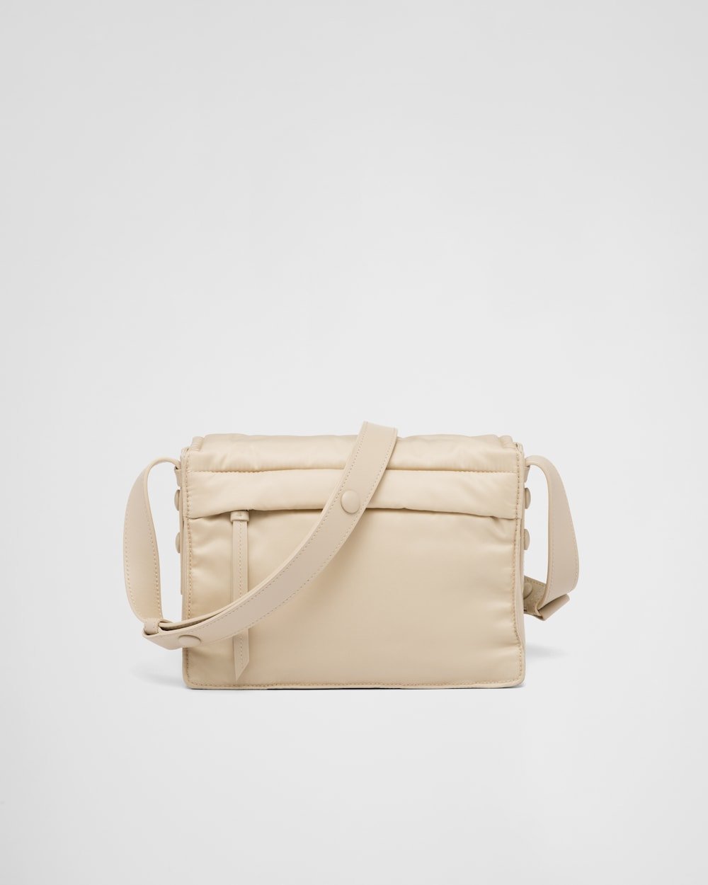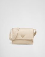 The hybrid concept pervades the Prada narrative and is translated into innovative designs with an interesting and unusual combination of materials, shapes, and functions. This flap bag with a sophisticated, feminine silhouette is reinterpreted in a technologically innovative material: Re-Nylon fabric, made of recycled plastic collected in the ocean. The padding gives the accessory a soft, contemporary look, and the adjustable leather shoulder strap allows it to be worn in different ways.