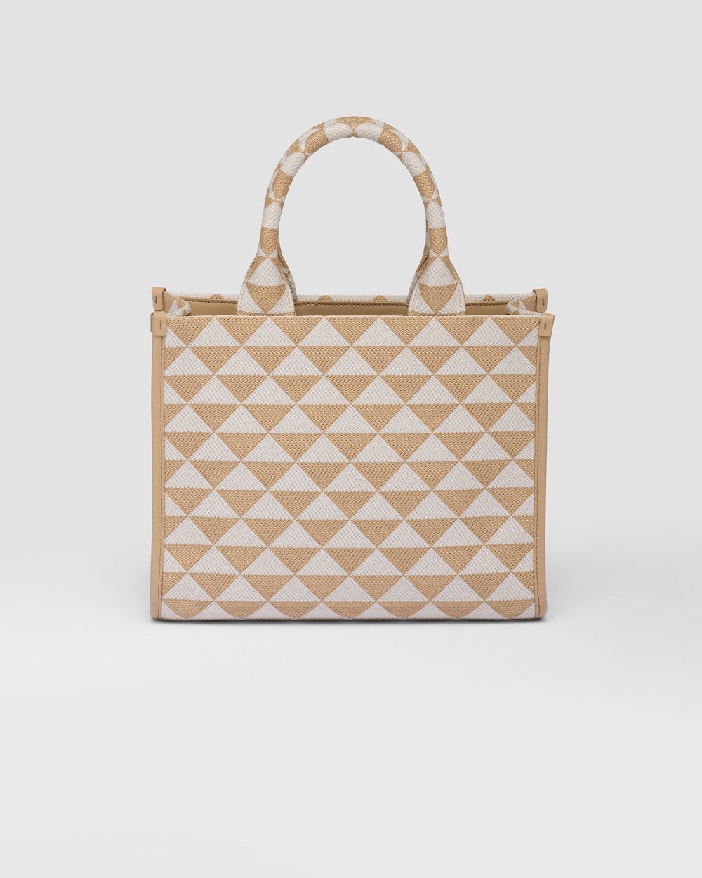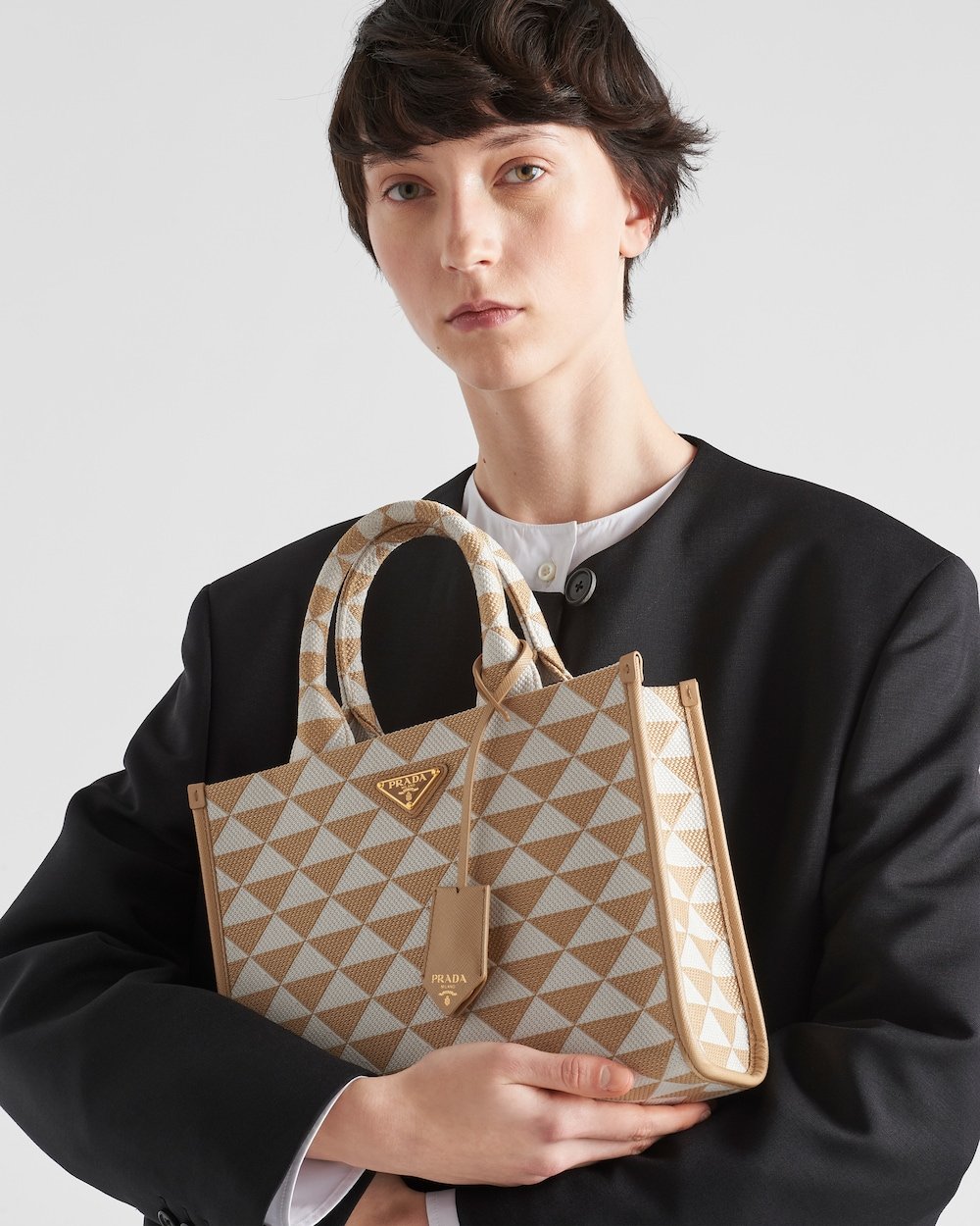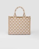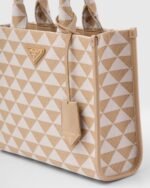 Introduced for the first time on trunks designed by Mario Prada, the Prada triangle expresses uniqueness and modernity through its universal, minimalist shape that is reinvented in a different way each season. Here, the geometric design is transformed into a sophisticated yet modernist pattern that plays with contrasting colors and decorates this sleek tote bag. Details in the brand’s iconic Saffiano leather embellish the design completed by a detachable shoulder strap that allows it to be worn in different ways.