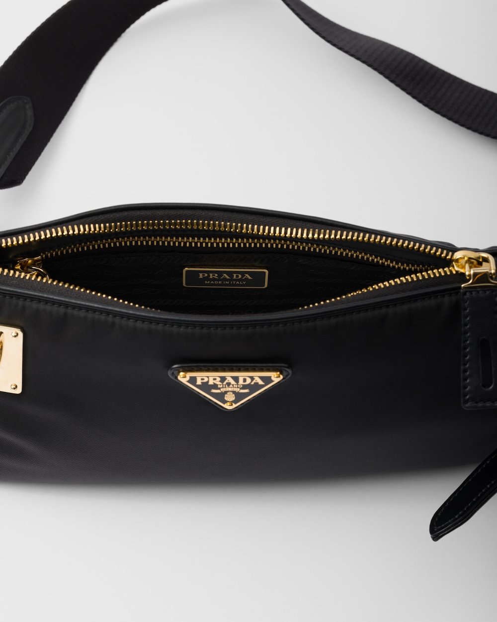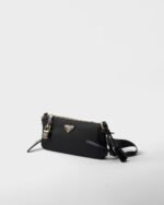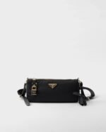 This compact bag with a refined silhouette that embodies the essence of Prada codes is made of Re-Nylon with leather details. The gold-tone metal hardware and the elegant small lock embellishing the closure complete the versatile, modern accessory.