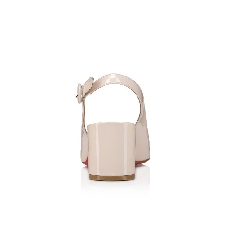 The timeless So Jane Sling pump enchants with sleek lines. This Maison Christian Louboutin slingback is crafted in Leche beige patent calf leather. It features a strap with a round tonal clasp on the side. This model reveals a low-cut vamp and is enhanced with a 55 cm slanted heel.
