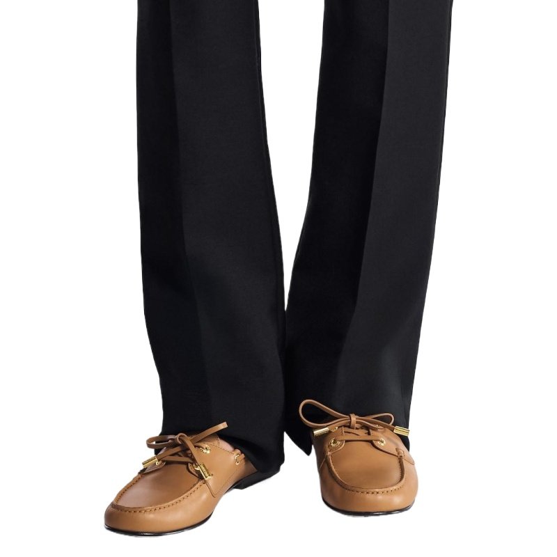 The Soho flat boat shoe in supple calf leather is a distinctive combination of an elegant loafer and a relaxed sailing shoe. The characteristic leather lace is threaded through Louis Vuitton-engraved eyelets and accessorized with Monogram Flower and LV Initials charms. This model is finished with a fine leather outsole.