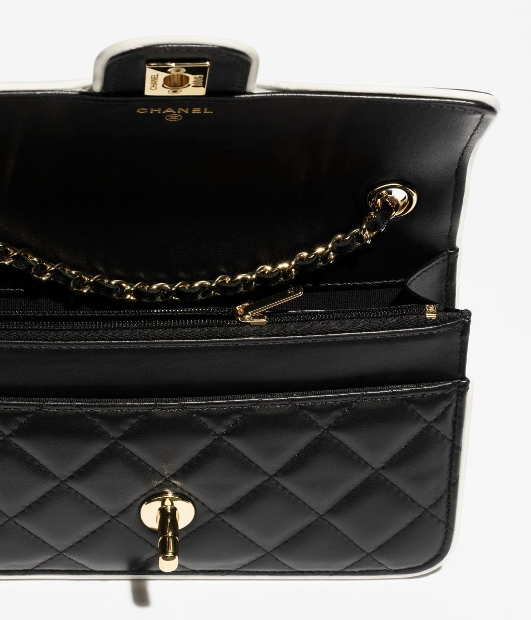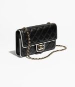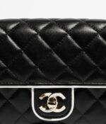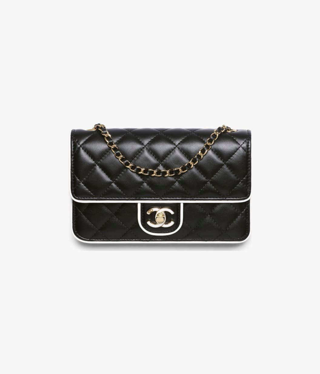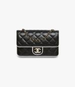 This Chanel Mini Frame flap bag is crafted from black lambskin with light gold hardware, contrasting white leather piping, light gold front flap with black enamel CC turnlock closure, half-moon back pocket, and interwoven light gold chain link and leather crossbody/shoulder strap.