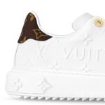 The emblematic Time Out sneaker is revisited in soft calf leather, which is debossed with the Louis Vuitton signature and the Monogram pattern. The design is complemented by a trim in recycled Monogram nylon at the back. This model is finished with an elevated rubber outsole with a 3-D pattern of Monogram Flowers.