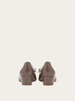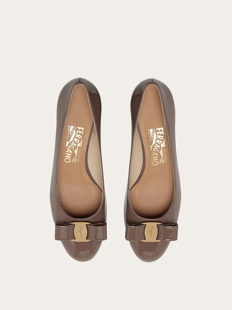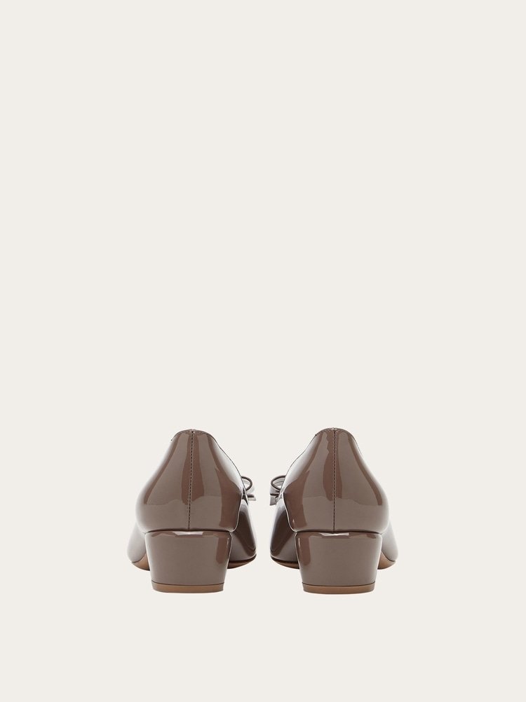 A Ferragamo classic with a new look. The timeless pump shoe with its rounded toe and wrapped heel has a slightly conical silhouette for a more modern edge. Made of naplak with a tonal Vara bow, this is the perfect slip on to complete formal looks or city daywear.