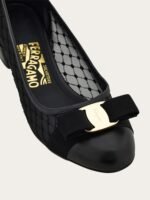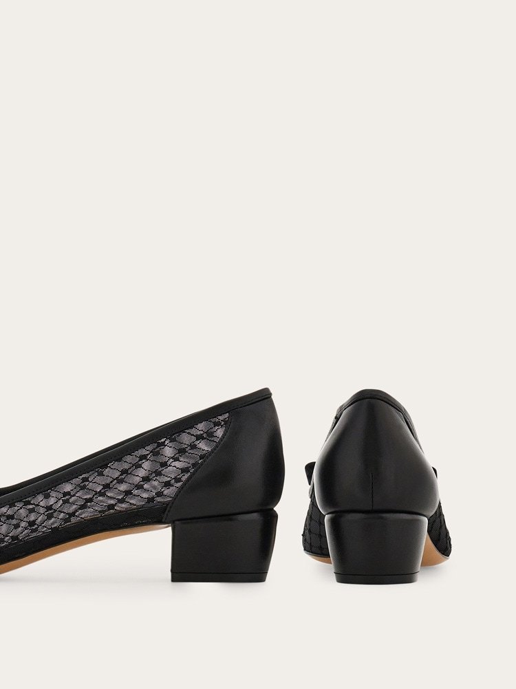 Fresh and feminine, the new variation of the Ferragamo pump features mesh inserts at the sides for an artisanal appeal. The structure is made of the softest kid leather at the heel and tip, and the trim that frames the delicate mesh sides. Available in both classic and seasonal hues, it has a tonal gros grain bow with golden buckle across the toe.