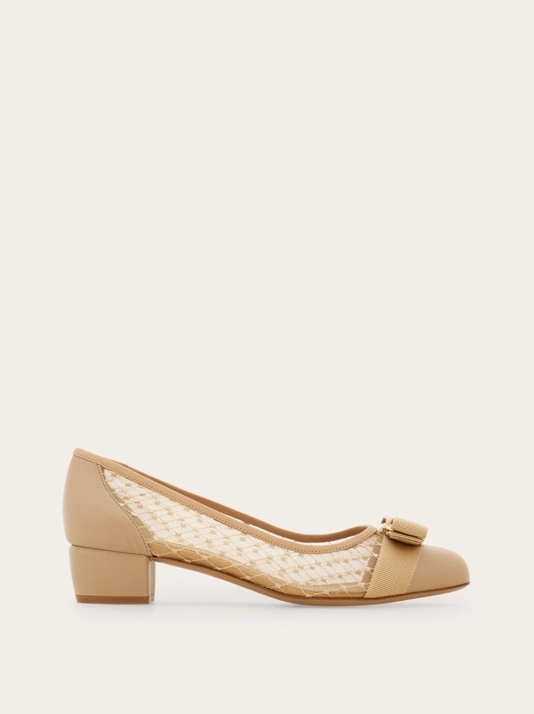 Fresh and feminine, the new variation of the Ferragamo pump features mesh inserts at the sides for an artisanal appeal. The structure is made of the softest kid leather at the heel and tip, and the trim that frames the delicate mesh sides. Available in both classic and seasonal hues, it has a tonal gros grain bow with golden buckle across the toe.