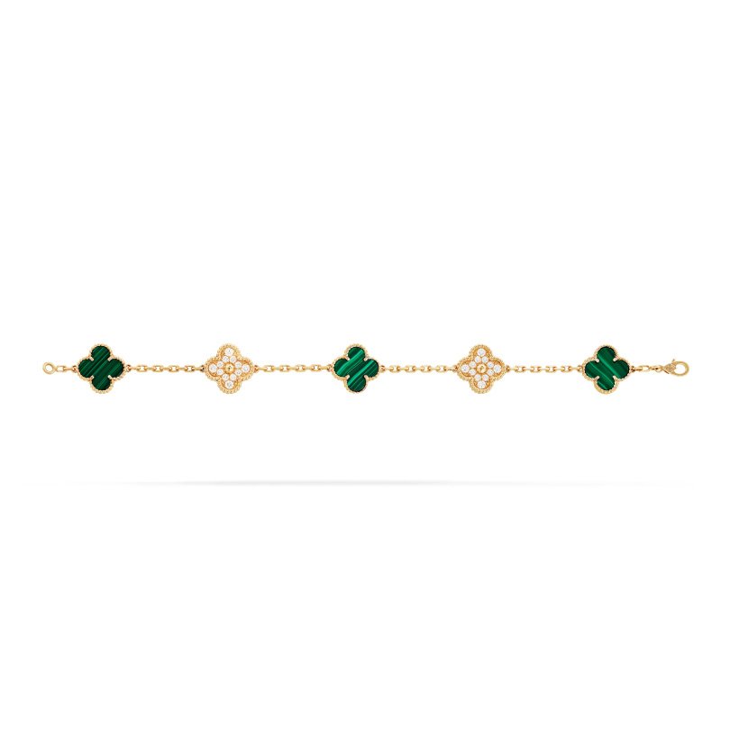 Vintage Alhambra bracelet, 5 motifs, 18K yellow gold, malachite, round diamonds; diamond quality DEF, IF to VVS.