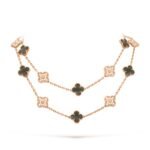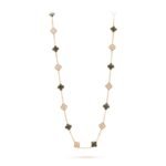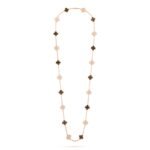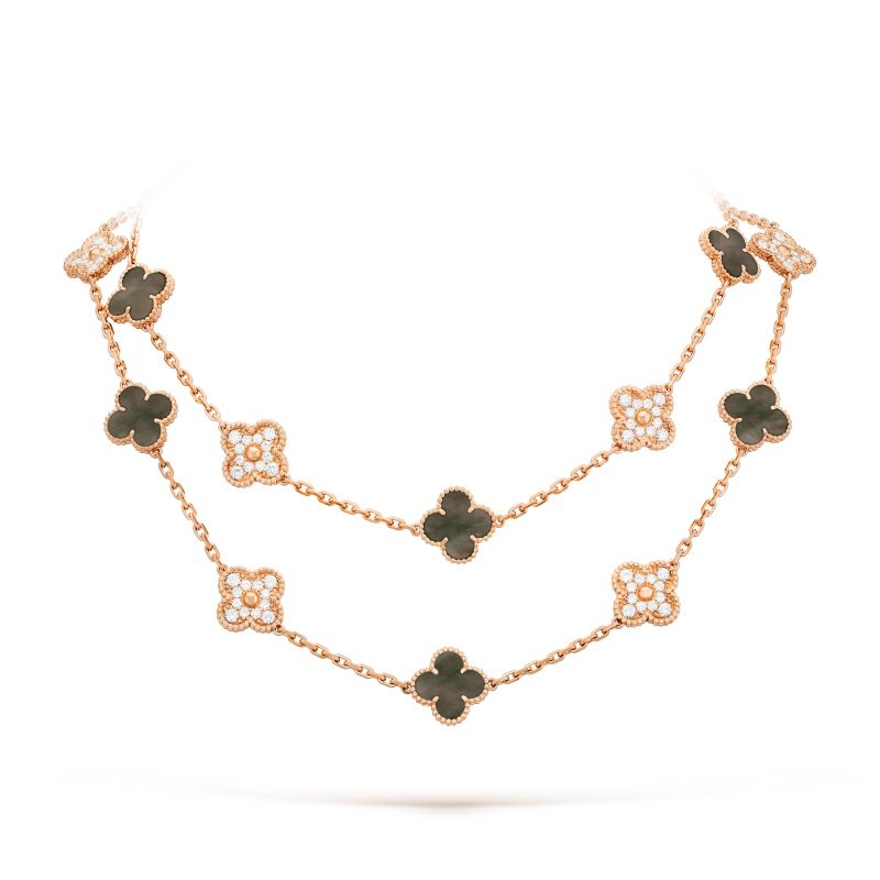 Vintage Alhambra long necklace, 20 motifs, 18K rose gold, gray mother-of-pearl, round diamonds; diamond quality DEF, IF to VVS.