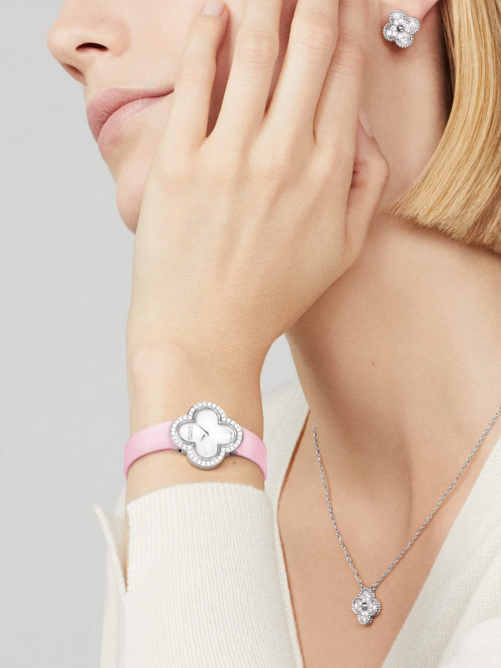 Vintage Alhambra pendant, rhodium plated 18K white gold, round diamonds; diamond quality DEF, IF to VVS.The pendant is attached to the necklace’s chain