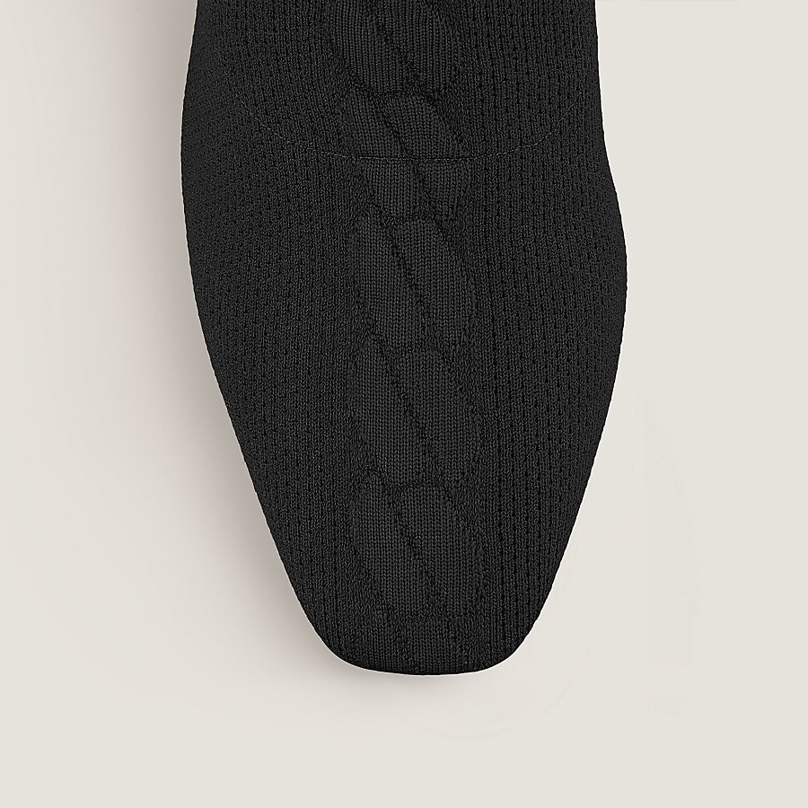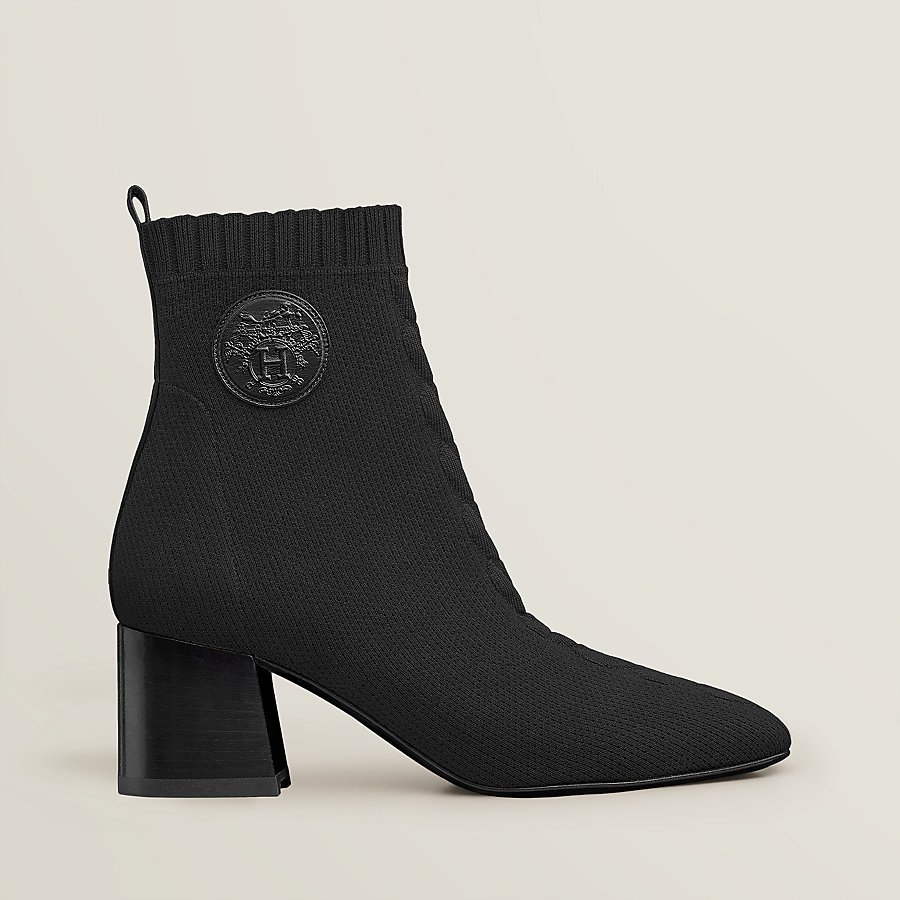 Ankle boot in knit with ‘Clic! C’est Noue’ motif, ‘Ex-Libris’ motif in calfskin and heel with horseshoe detail.