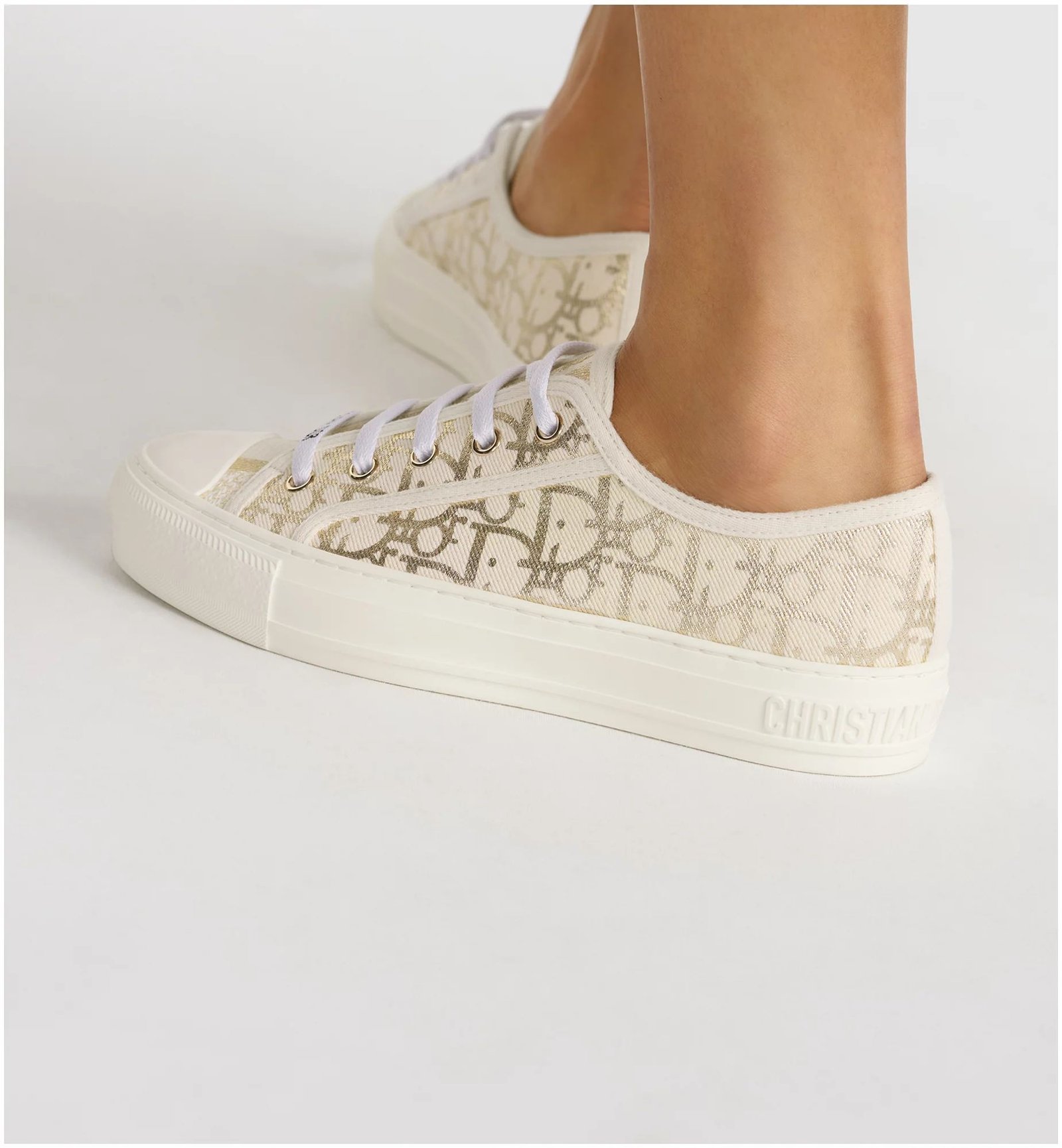 The Walk’n’Dior sneaker presents a modern silhouette in white cotton canvas showcasing the gold-tone Dior Oblique motif. Its relaxed design is completed by signatures on the tongue, rubber sole and laces for a timeless look. The comfortable sneaker will lend a modern touch to any attire.