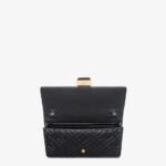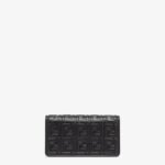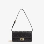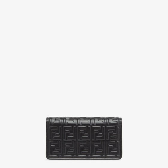 Compact Baguette wallet with flap and FF clasp. Interior compartment with six card slots. Double shoulder strap, an adjustable leather option and a detachable thin chain option:to carry the bag like a clutch, under the arm or wear it cross-body. Made of black nappa leather with embossed FF motif. Gold-finish metalware.