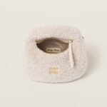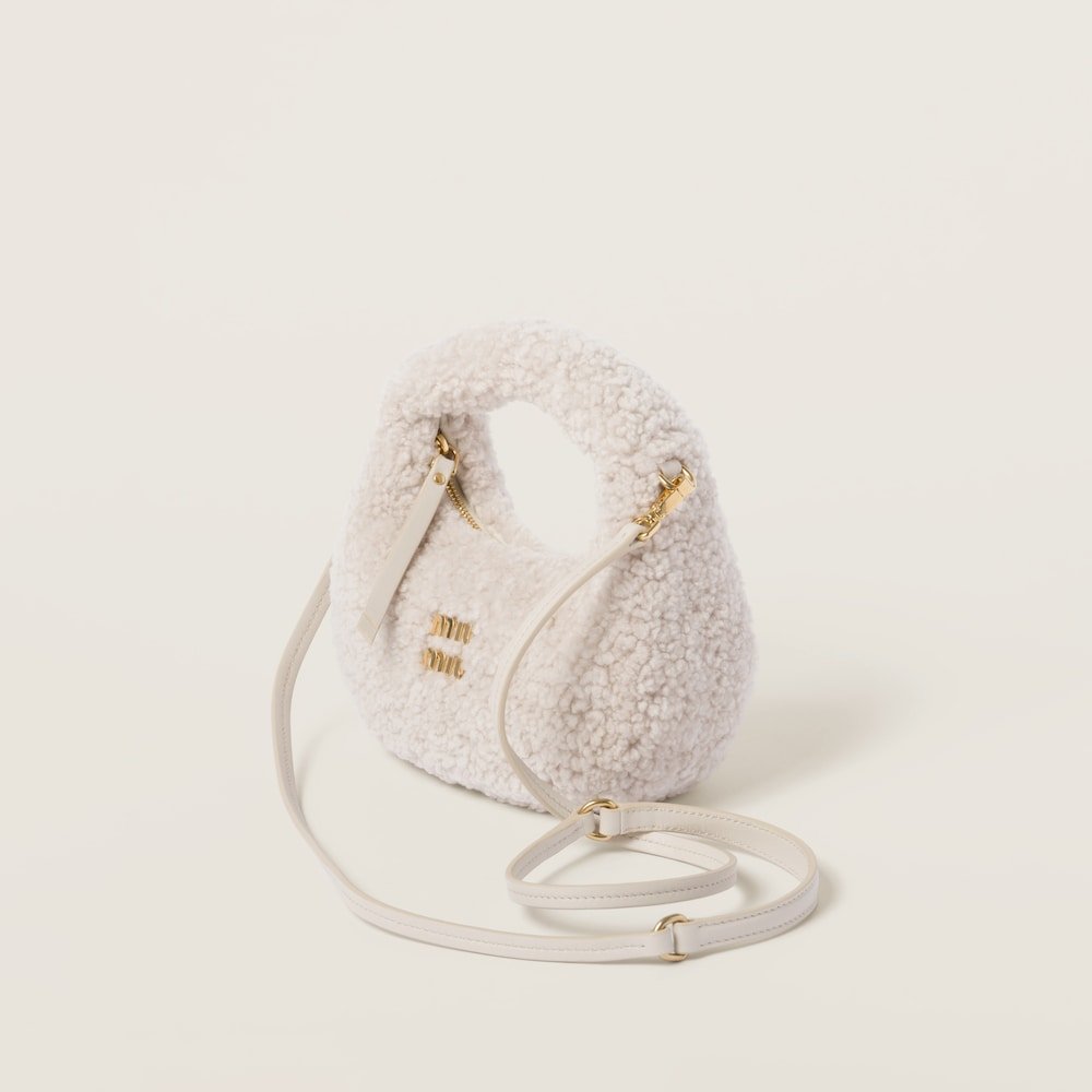 The Wander bag is reinterpreted, season after season, becoming the iconic protagonist of Miu Miu collections. This shearling version has a rounded style that is soft and cozy. Metal hardware adds shiny touches while the lettering logo completes the design with an iconic note.