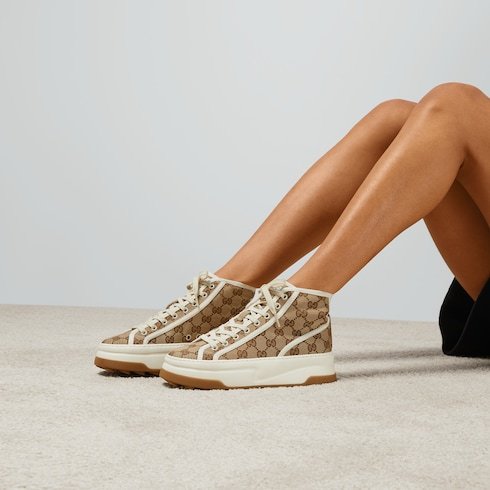 A striking silhouette that takes inspiration from the tennis courts. Presented in a classic beige and ebony Original GG canvas, this high top sneaker features a chunky sole and a contrasting fabric trim for a contemporary aesthetic.