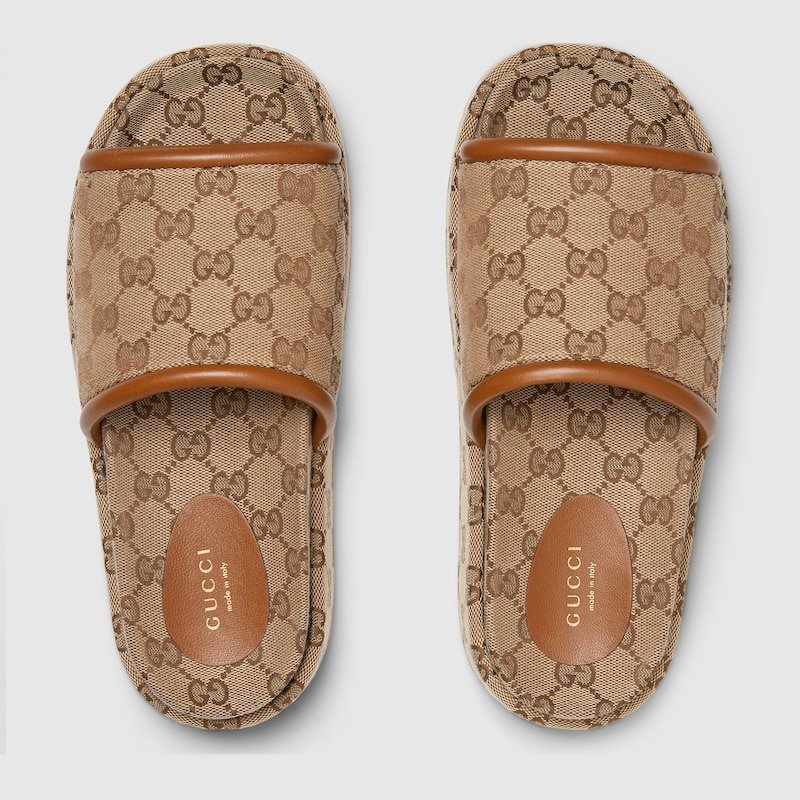Emblematic codes of the House and refined patterns are reinterpreted in contemporary ways for the latest Gucci collection. This wedge sandal is crafted in GG canvas and is defined by the signature silhouette.
