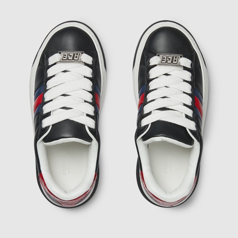 The well-known Ace sneaker continues to be a mainstay of the House’s narrative.The low-top silhouette is reimagined in a chunkier construction with emblematic details. Crafted from black lightweight leather, the style is defined by a padded leather Web detail, while a maxi metal ‘Ace’ tag shines on the lace-up closure.