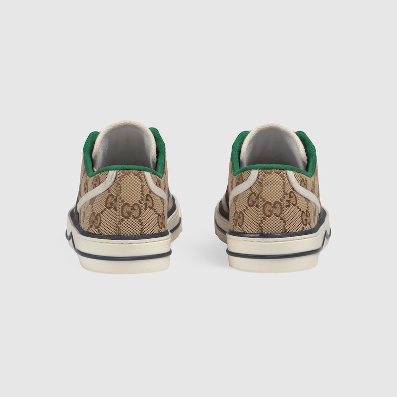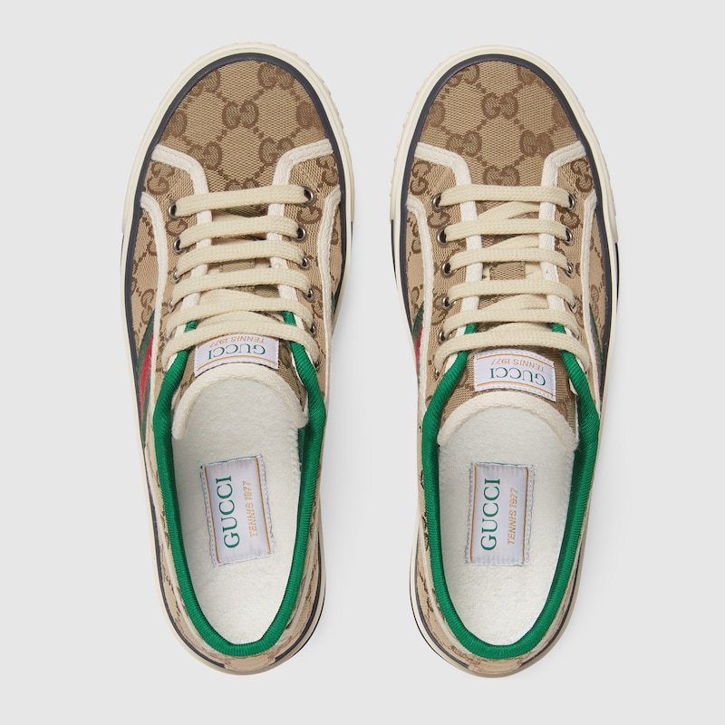 The low-top sneaker is presented in Original GG canvas in its classic color combination of beige and ebony. The style combines different elements from the House’s heritage such as the Gucci Tennis 1977 label, a textured GG motif at the sole and the Web??details which recall the House’s connection to the world of sports and leisure.