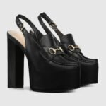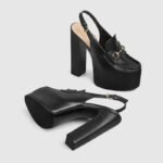Gucci continues to feature archival symbols. For the latest collection, the Horsebit hardware recalls the House’s equestrian heritage. This pair of women’s slingbacks are defines by the platform high heel that offers stability and comfort.