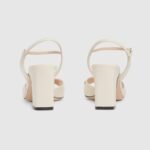 The signature Horsebit defines this pair of black leather sandals with an open toe. A mid-heel and adjustable buckle closure complete the style.