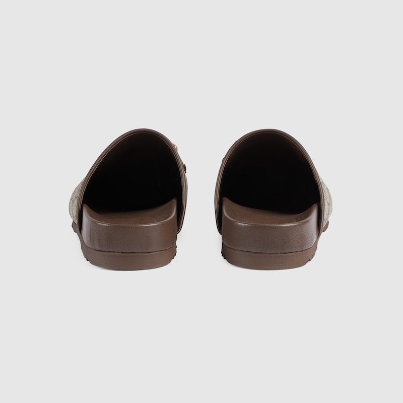 Mirroring the material’s historic origins, GG Supreme is introduced in a timeless mix of beige and ebony for this latest Gucci collection. The canvas has come to the front of each collection decade after decade to become a hallmark of the House. Here, the classic palette defines this pair Horsebit slippers.