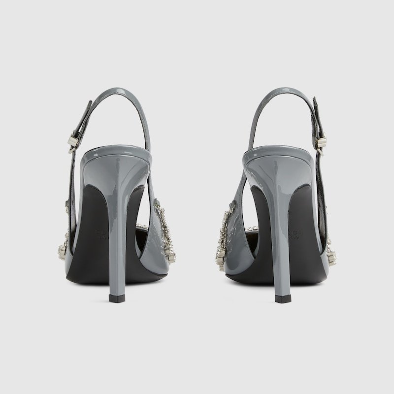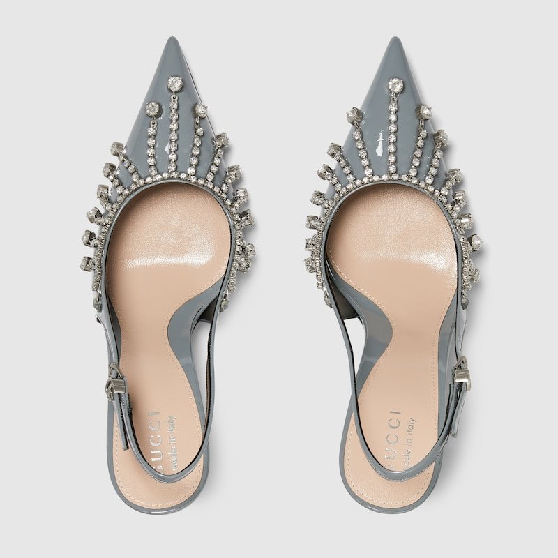 Handstitched details bring a refined and bold touch to the designs of the new collection. This pair of pumps features an ultra-feminine silhouette and glossy patent leather, further enhanced by a chain of crystals.