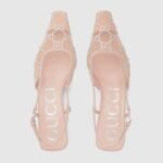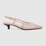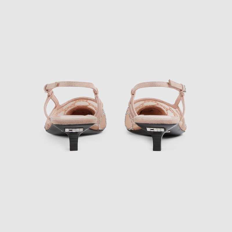 The Gucci Aria collection takes references from the archives of the ’90s and early ‘2000s, with pieces inspired from Tom Ford’s era in Gucci. The new idea of femininity shows glamorous details, such as lace, crystals and sheer fabrics. This pair of slingback shoes are presented in a light shade of rose mesh with a sparkling GG motif.