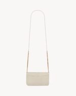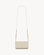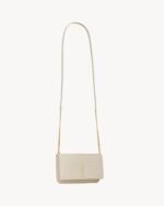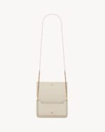 Cell phone holder with front flap decorated WITH THE CASSANDRE, featuring a leather and chain shoulder strap.