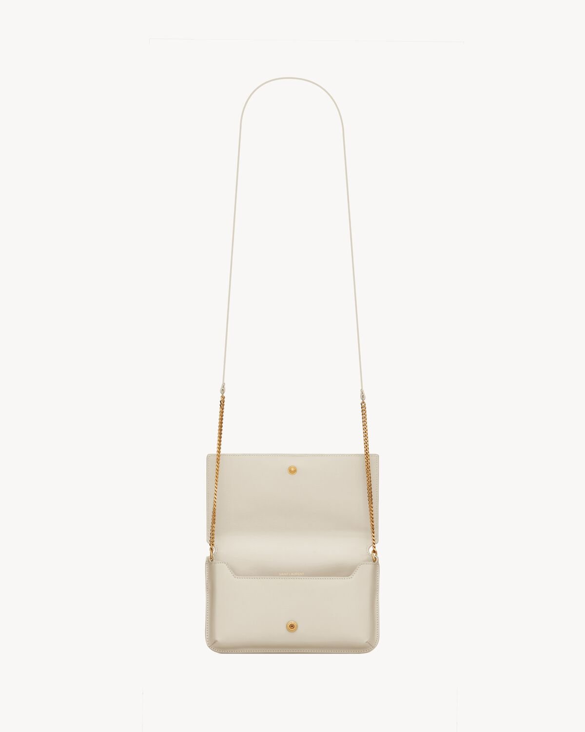 Cell phone holder with front flap decorated WITH THE CASSANDRE, featuring a leather and chain shoulder strap.