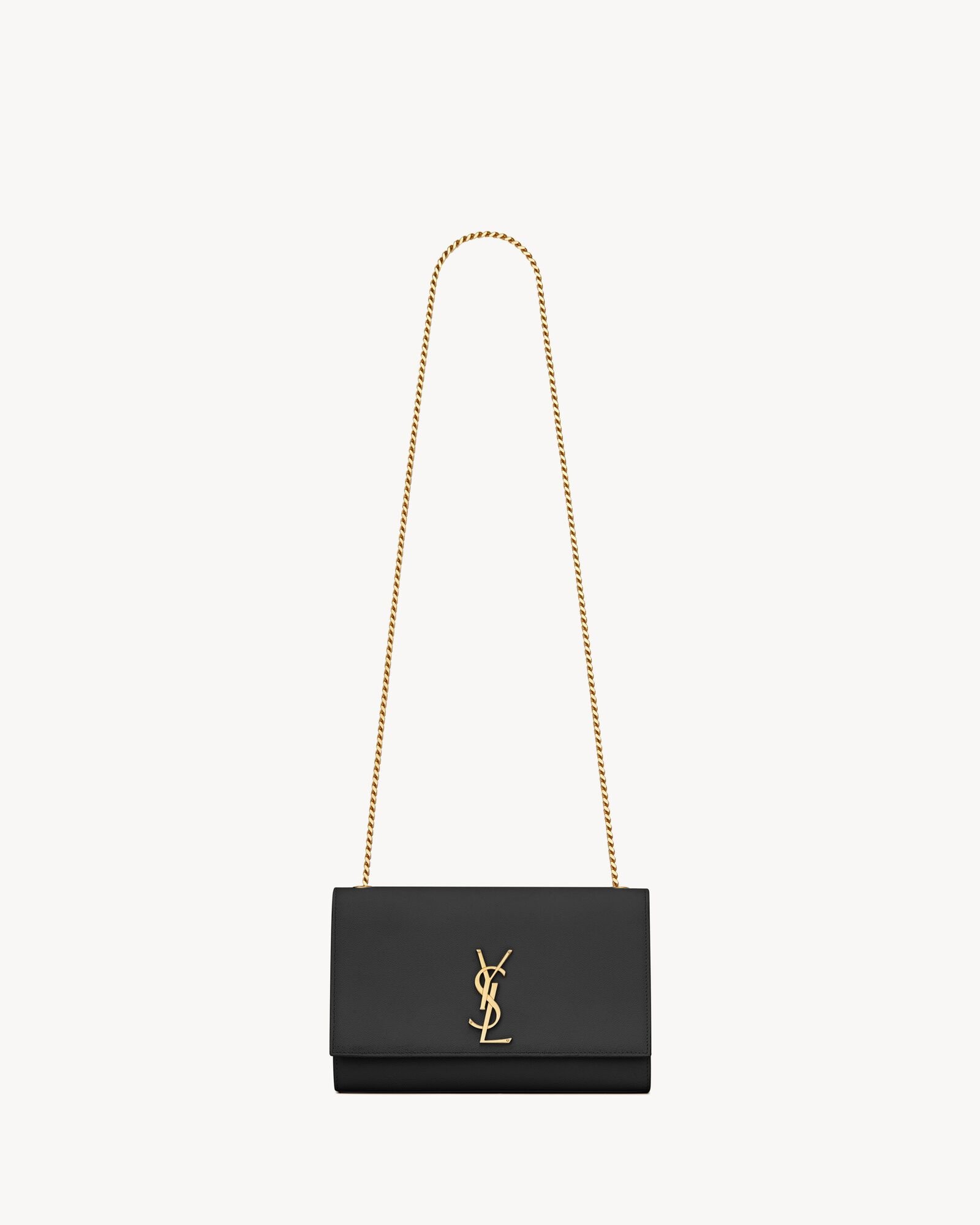 ICONIQUE KATE BAG IN GRAIN DE POUDRE EMBOSSED LEATHER, FEATURING THE CASSANDRE AND CURB CHAIN. WORN ON THE SHOULDER OR CROSSBODY.